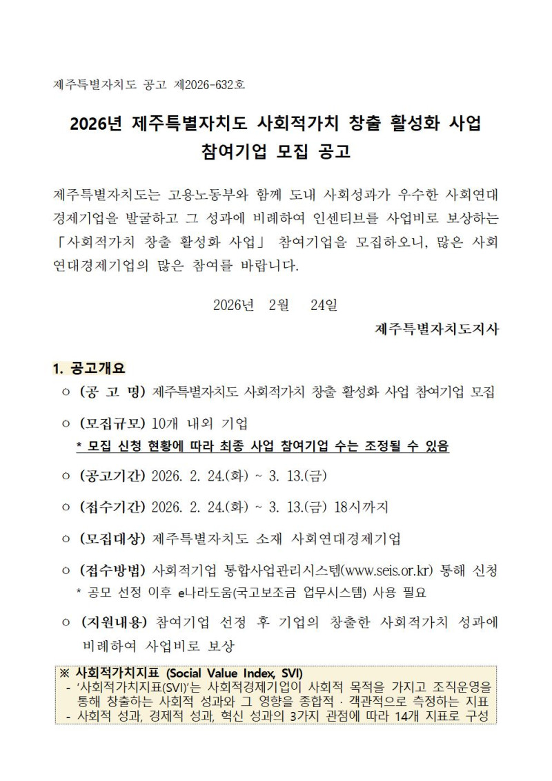 2026년 제주특별자치도 사회적가치 창출 활성화 사업 참여기업 모집 2026-03-03 11:21:54 작성자공공구매지원단 (sejeju) 조회수5 파일등록 업로드 용량은 최대 5M입니다. 파일선택 비밀번호 취소 닫기 첨부파일(2) 파일 로딩중 Facebook Twitter Kakaostory google 프린터 목록 수정 답글 삭제 게시물삭제 삭제하신 데이터는 복구가 불가능합니다. 게시물 2026년 제주특별자치도 사회적가치 창출 활성화 사업 참여기업 모집 비밀번호 취소 닫기